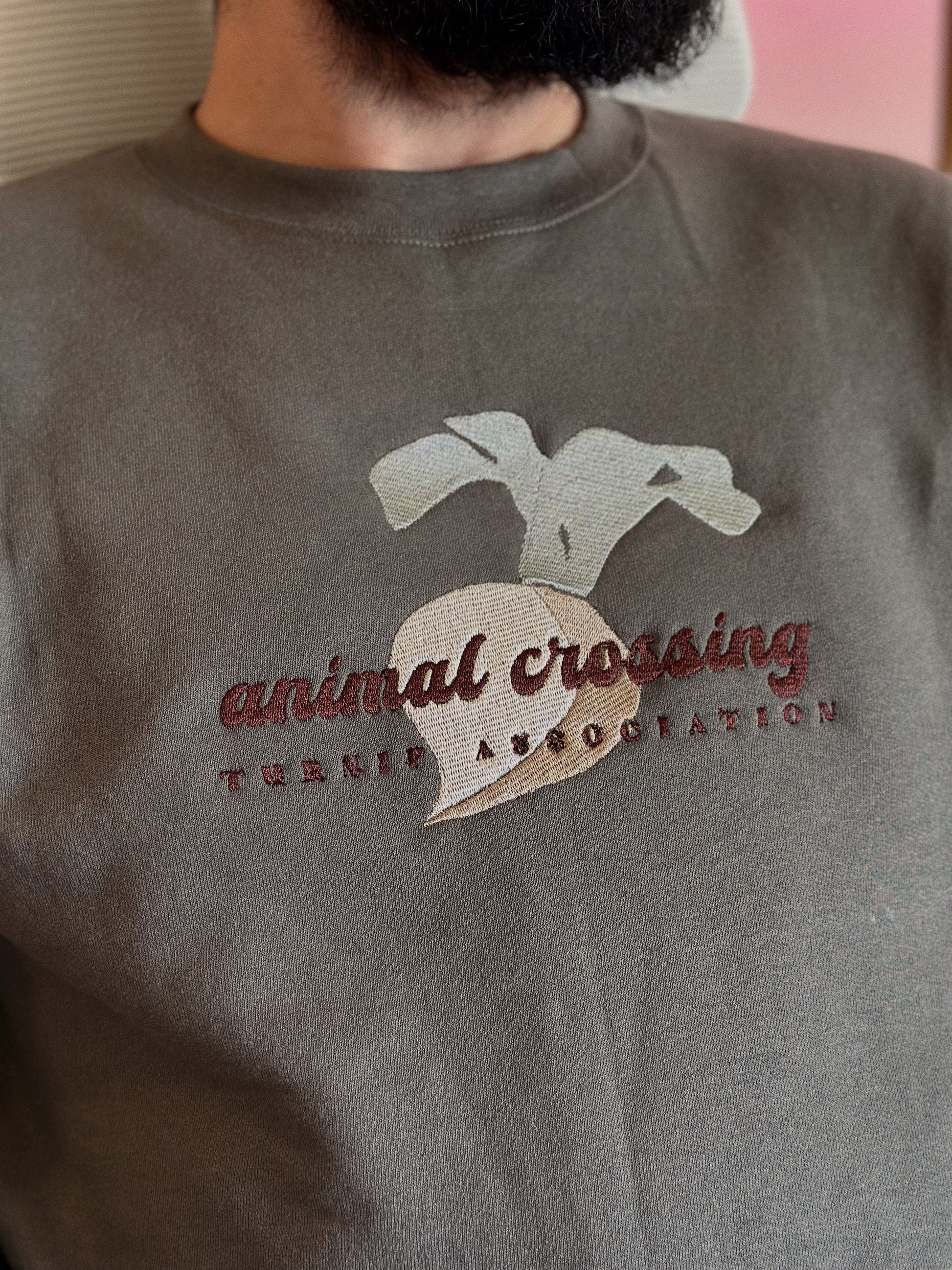 Super cozy forest green sweatshirt with neutral colored stitching! True to size unisex. Vintage Animal Crossing Turnip Association embroidered sweatshirt.